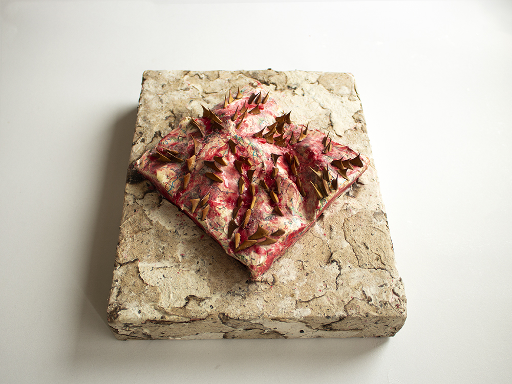 - Technique: mixed media (carboard, burnt paper, collage, sponge, thorns)